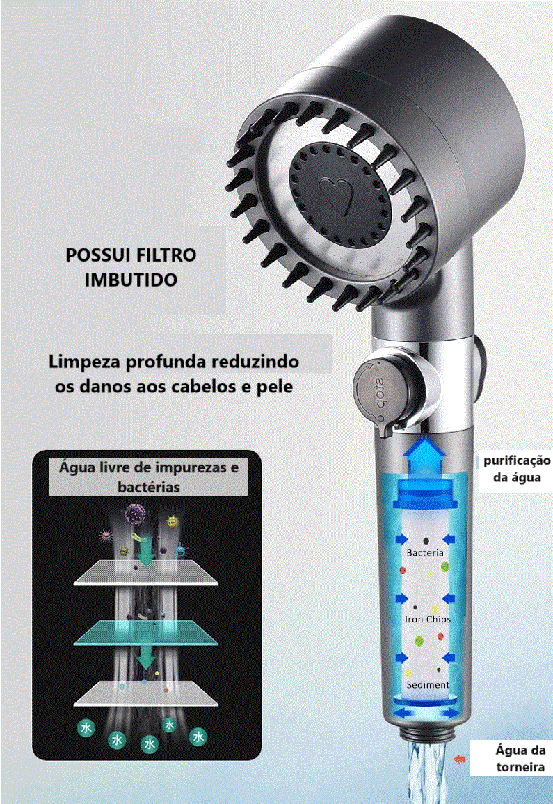 Tenha a tranquilidade de um banho mais saudável com água purificada: o filtro integrado do chuveirinho elimina impurezas, trazendo mais conforto e cuidado para sua pele e cabelo.